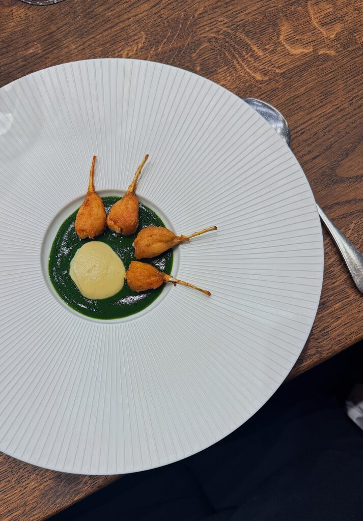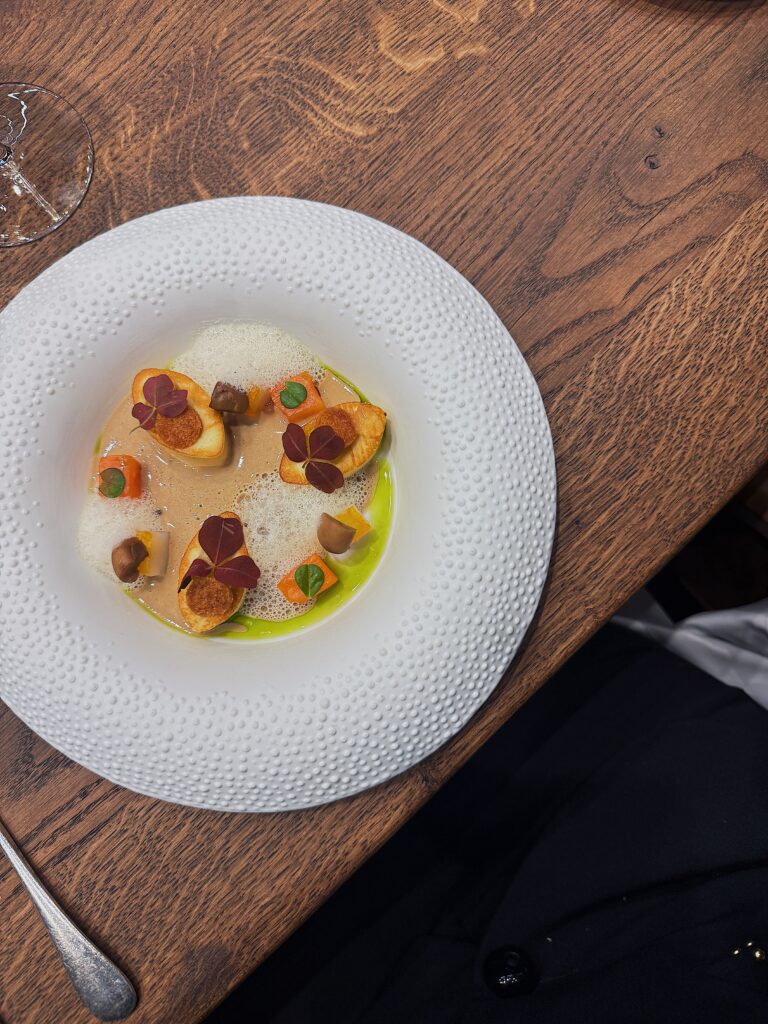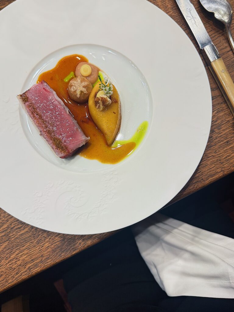 Assise à table ce 15 décembre, ce n’est pas une cuisine à sensations qui vient nous étreindre, et ce n’est d’ailleurs pas ce que l’on vient chercher ici. On retrouve cette grande cuisine rassurante, chaleureuse, profondément en phase avec l’auberge et ses lettres de noblesse. Les jambonnettes de grenouilles, la pochouse contemporaine ou le homard bleu de Bretagne rôti parlent d’un goût franc, maîtrisé. Fidèle à l’esprit Bernard Loiseau, Jean-Philippe Vigilant incarne une élégance qui trouve son sens dans le soin.
